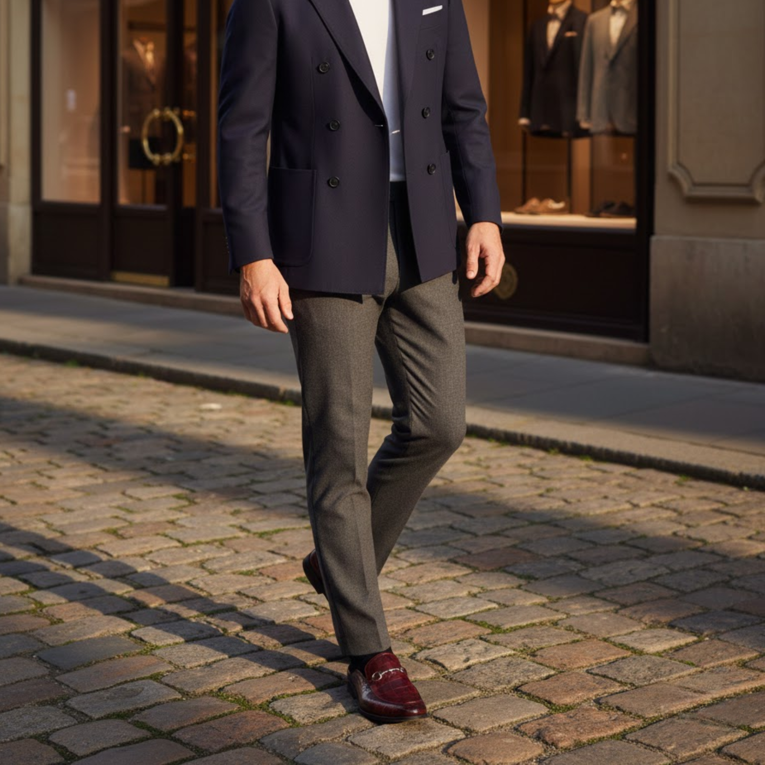 These men’s loafers feature a slip-on mule construction with an open back and a rounded toe. The upper is finished with an all-over embossed pattern and a metal bit detail across the vamp. A low-profile sole with a flat forefoot and slight heel creates a clean, structured silhouette suitable for formal wear.