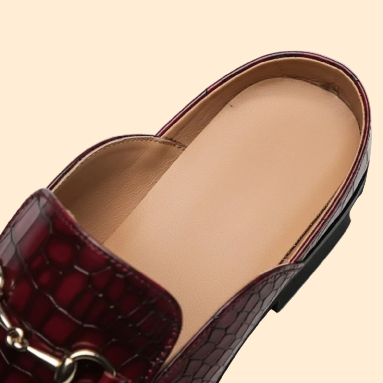 Design: Slip-on mule loafer with rounded toe, embossed upper, and metal bit detail